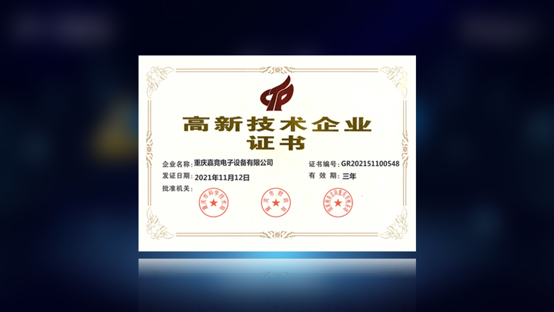 重慶嘉競(jìng)電子設(shè)備有限公司獲高新技術(shù)企業(yè)證書